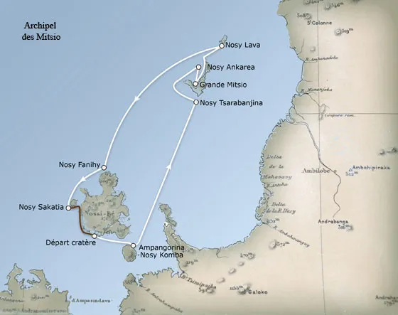 Cette île à une encablure de l’Ouest de Nosy Andantsara est constituée de plusieurs îlots reliés par des bancs de sable. Encore plus découpé que ses îles sœurs, son relief est remarquable, véritables citadelles de pierres surgissant des flots.